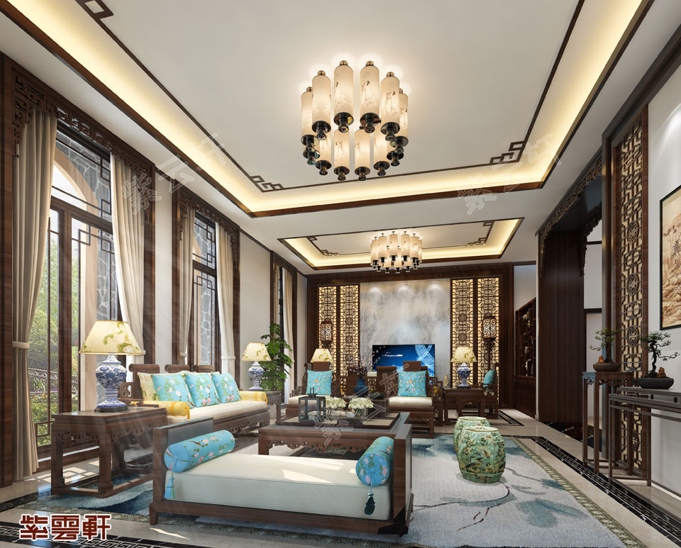 客厅,现代简约风尚使整体空间更具传统韵味,沙发上蓝色靠枕与深沉木色搭配更显中式特色,花格木雕元素处处显露出古典雅韵,每一个角落都在简单的中式元素运用中沉淀出中国传统文化的魅力,每一个装饰品都恰到好处,每一个细节都能体现中式装修设计的与众不同。