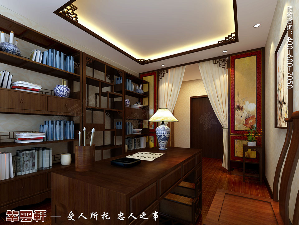 书房,它需要一个非常安静的氛围。由于中国家具的颜色浓重,搭配中式书柜和摆放收集的诗集不会显得空洞,书桌上青花瓷的暖色柔光让整个空间得到升华。住宅中式装修中有这样一间书房更能陶冶情操,让我们成长。