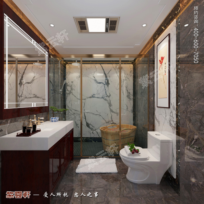 卫浴室,现代简约设计,大理石与红木相互搭配融合成一种清亮简约之感,干湿分离的设计更加人性化,简单装饰的传统古画营造出一丝意境。
