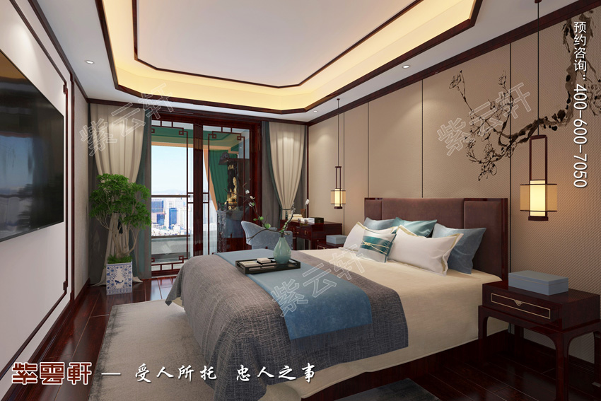 男孩房,在一派儒雅清新的环境中体现出中式古典之风采,床头淡雅树梢背景图意境十足,彰显着中式留白之美,加之绿植的点缀更是锦上添花。豪宅中式设计中有这样一间男孩房更能彰显设计师的匠心独运。
