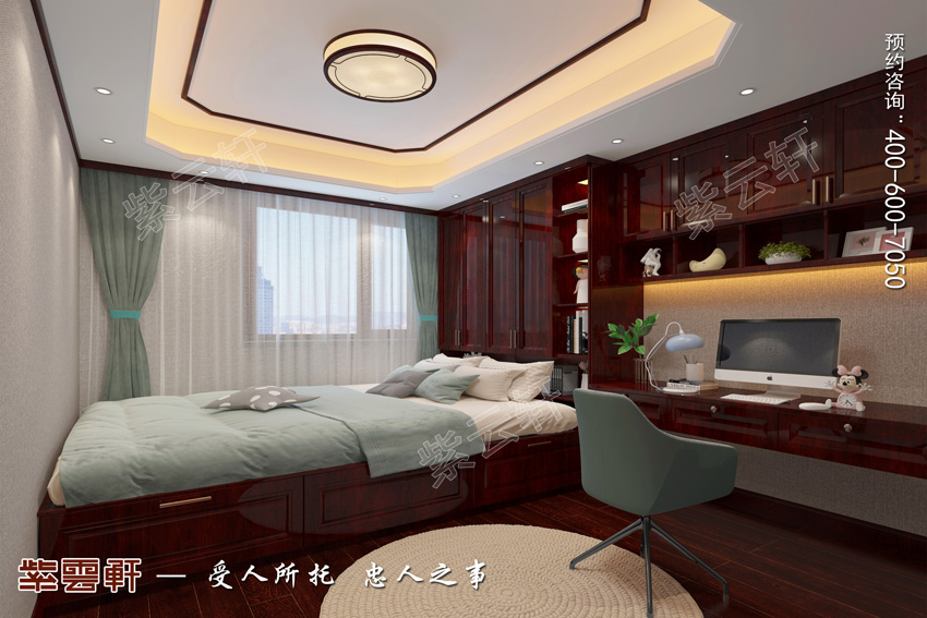 暖阁,箱型榻设计更为经典别致,浅淡的薄荷绿色床品与同色系的窗帘相互搭配,显得格外清爽怡人,床头红木收纳柜十分便捷,休闲处的简约设计方便随时办公学习。