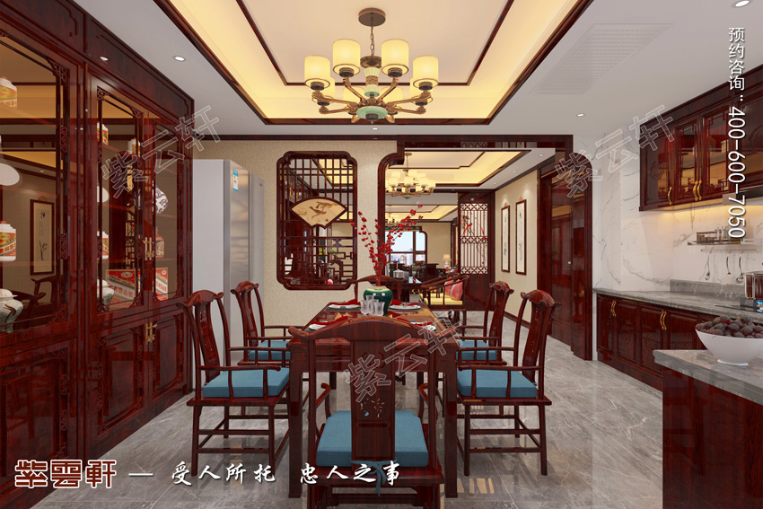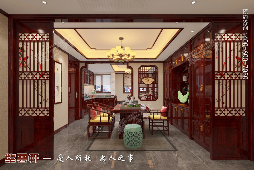 茶室,穿过花格门楣映入眼帘的茶室内景,给予厅区开放尺度里唯美而高雅的背景,雅中见质,独具优雅,反映居住者高雅而悠然的生活态度。中式装修风格中唯雅字为探究空间内在的纯粹力量。