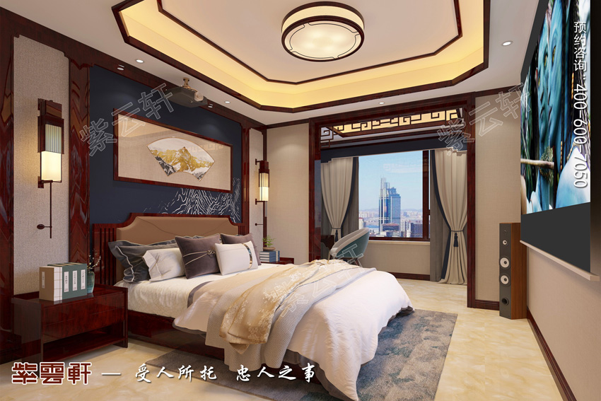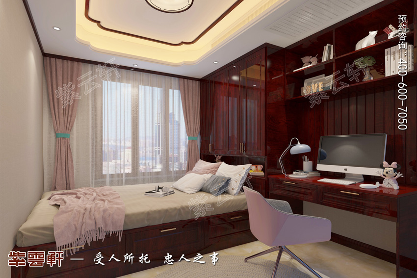 女儿房,以粉色系为主,双层窗帘让整个卧室有一种朦胧的感觉,更方便入睡。一侧的红木家具实用性非常强,可以放置衣物、装饰品,还可以做书桌使用,给工作和学习营造了良好的氛围。在传统风格浓郁的卧室中,学习传统文化,更是一种传承与延续。这样的中式设计卧室,有女儿的业主一定要参考一下哦。