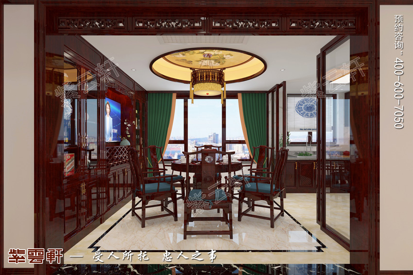 餐厅,餐厅与厨房相连,增加了用餐的方便性。古朴的实木餐桌椅有一定的雕刻和弧度,代表着美好的寓意,是典型的古典中式装修风格,加上仿古宫灯作吊饰,柔和的光映在红木家具上,一片祥和之景映入眼帘,更容易让人卸下一身的疲惫享受美食。