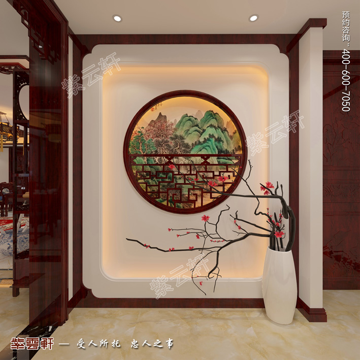 门厅,住宅中式设计对于门厅的装修也是十分讲究的,进门就能看到雅致的风景,角落里的梅花正含苞待放,散发出诱人的香气,忍不住想要赶快进去参观一下。