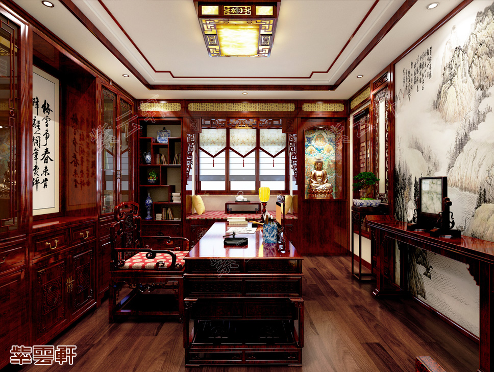 书房,丰富的字画装饰让人如置身画境一般,浓厚的文化气氛孕育出俊秀清奇的气质,红木书柜与写字台的典雅之气,提升了整个房子的格局,更是这套案例中一个独特的风景,也展现出中式住宅装修的与众不同。