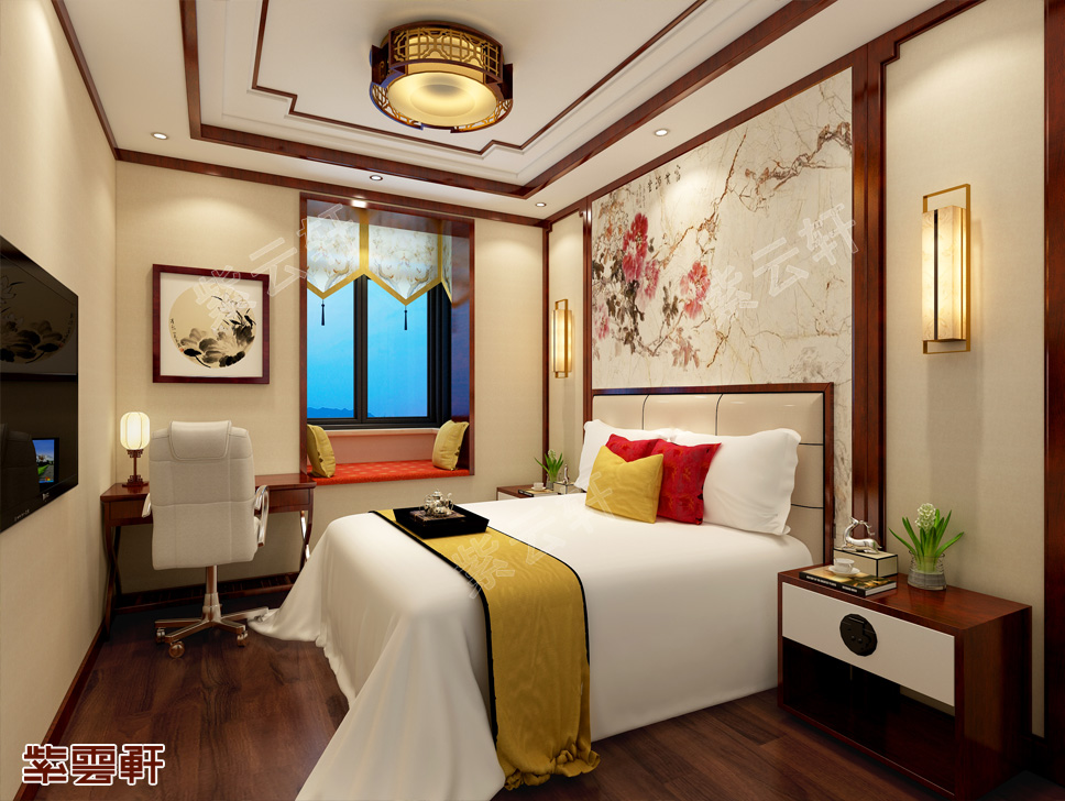 卧室,红木花格包裹中式风景画的经典设计,在简雅的空间布局中诠释着何为中式简约风格装修的娴静和优雅。适当的木材点缀,给人温润舒适的感觉,简洁美观的同时也不失时尚气息与浪漫情调。