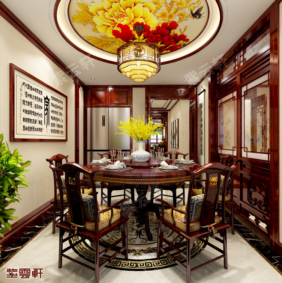 餐厅,华美绚丽的中式家具,以及干净通透的设计格局,都沾染着中式风格的清灵典雅,无论是字画或是家具,各种木件点缀形韵相补,意气相得,最终浑然一体。