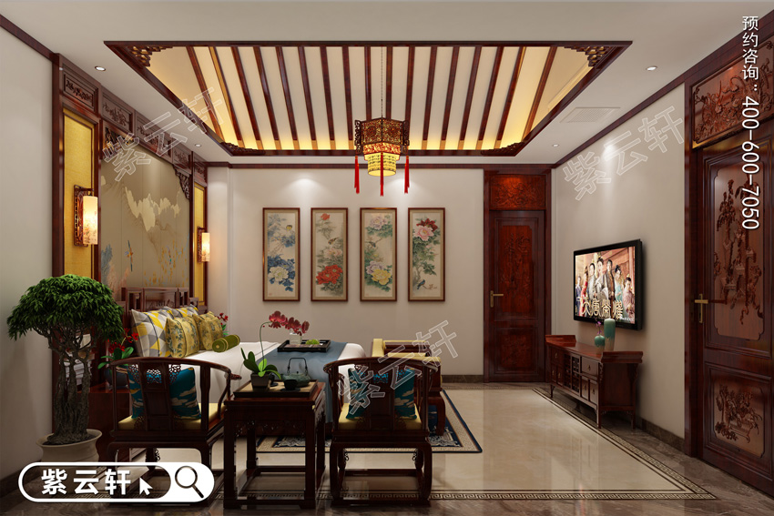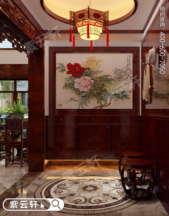 玄关,整体红木保护墙中,一幅富贵牡丹彩绘画作使整体空间更具华贵气质,圆形的地板花纹与圆形藻井相呼应,形成了别致景象。仅仅是入户,就感受到中式住宅装修的与众不同,迫不及待的想进去参观一下。