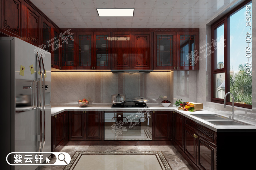 厨房,红木与不锈钢的结合更具现代简约元素,合围式橱柜组合增添了私密性。大理石台面上陈列的果蔬点缀多了一丝生活气息。