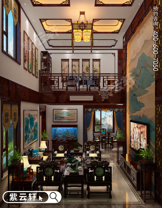 客厅,复式挑高设计将整体空间立体感拉提升,福庆灵芝椅组合将中式的古典与内涵展现的淋漓尽致,背景处渲染的锦绣山河图展现出传统艺术的独特魅力。周边绿植的点缀使整体空间更具生动灵性。