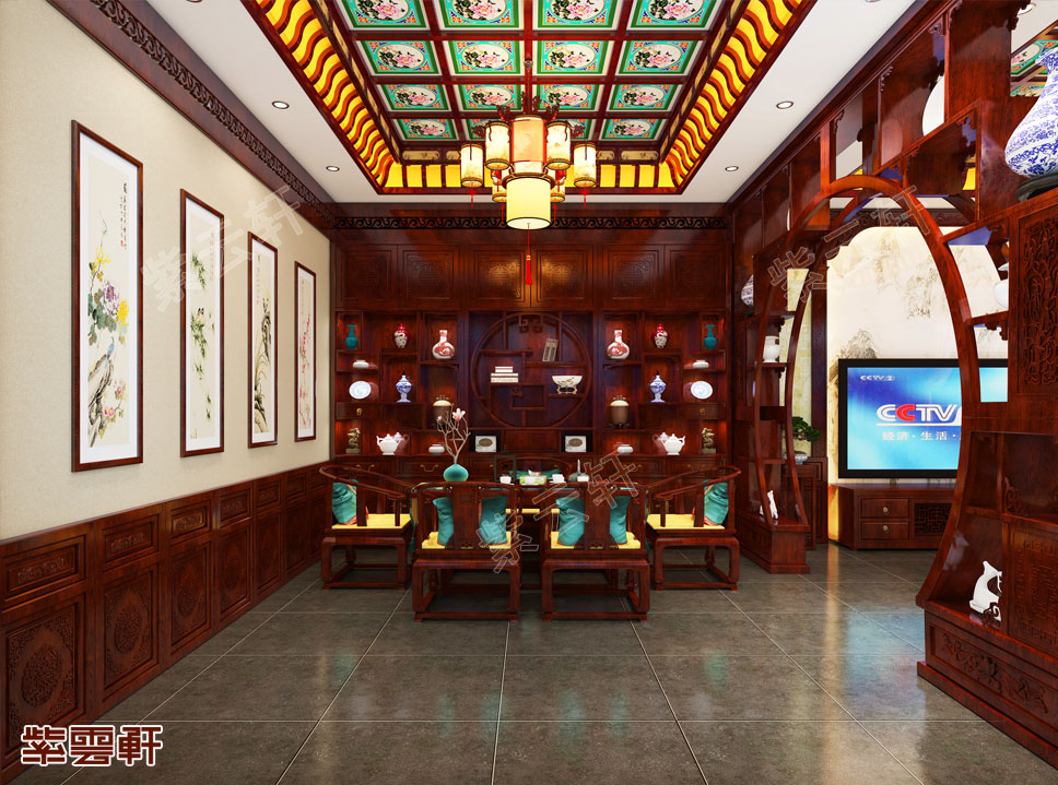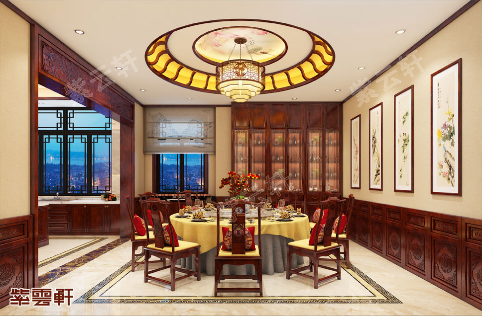 餐厅,大面积红木空间,独具传统特色的座椅点缀,活跃了整体视线,在仿古宫灯的烘托下增添了餐厅温馨的氛围,娇艳的鲜花格配古典韵味花瓶,为餐厅营造出欢快的就餐氛围。整体空间还搭配了梅兰竹菊的组合国画,只为打造出温良和谐的餐厅环境。