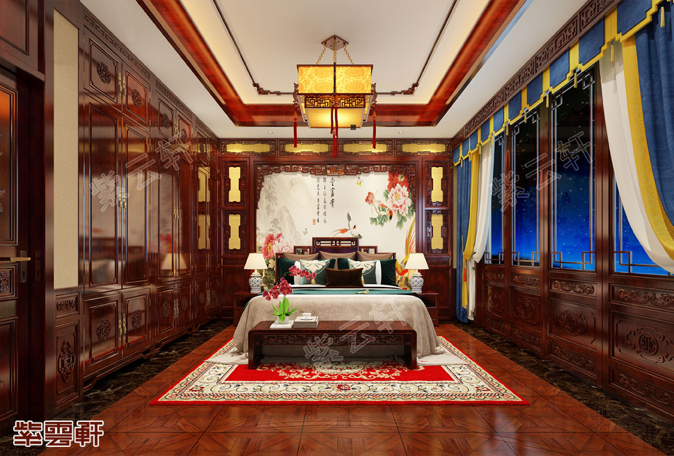卧室,解压宁静的空间氛围将古典之美由内而外的展现出来,整体上红木为主,搭配传统牡丹图的背景令卧室焕发别样生机,中式挂落的点缀更是增添了古典魅力。中式设计的卧室不仅在视觉上创造了惊奇感,而且通过灯光创造出现代、优雅、时尚感觉。